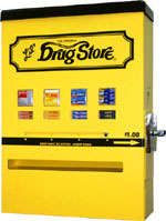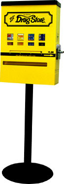 LIL’ DRUG STORE MEDICAL VENDING MACHINES – Machines dispense Lil’ Drug Store Take2 boxed products such as OTC medicines and Trojan condoms. Durable 16 gauges steel powder coated paint finish. Separate keyed compartments for medication and coins. All steel coin mechanism. Designed to be wall mounted. Optional pedestal bases, stands and cabinets are available.